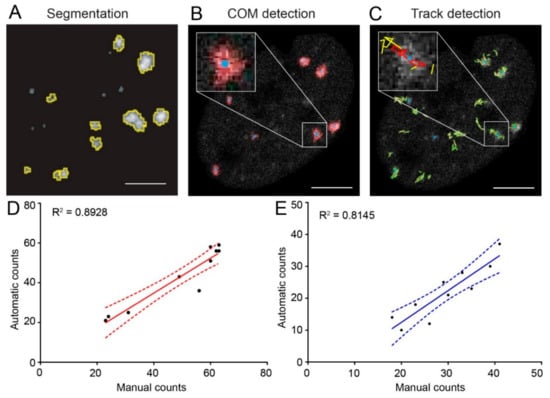 The segmentation of foci in each consecutive frame allowed tracking of individual 53BP1-GFP foci in time. With the use of an algorithm, on the basis of a threshold of 0.7-µm change, the individual foci were linked together between consecutive frames, which formed focus tracks in time. The linking process was based on the distance between the center of mass (COM) points of the focus in consecutive frames (Figure 1B,C). Focus tracks generated from α-particle-irradiated and X-ray-irradiated cells were analyzed. In order to evaluate the quality of our segmentation method, we analyzed the correlation between manual and script-based counting measurements of 10 random cell nuclei. The correlation plots showed good correlation for α-particle-irradiated cells (R2 = 0.89) and X-ray-irradiated cells (R2 = 0.82) (Figure 1D,E). Using this newly developed semi-automated analysis, we compared the DSB processing dynamics, marked by 53BP1-GFP, of α-particle-irradiated cells with X-ray-irradiated cells.