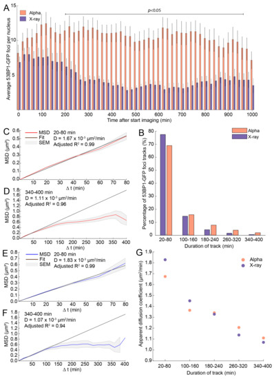 First, we determined the mean square displacement (MSD) which was plotted per track duration group (Figure 2C–F and Figure S1). The curvature of an MSD plot can indicate whether the mobility of foci is apparent diffusion (linear line) or confined motion (curved plot). We observed no difference in mobility of 53BP1-GFP foci when we compared α-particle-irradiated cells to X-ray-irradiated cells. The curvature of tracks which were shorter than 100 min showed a linear MSD plot, while tracks which were longer than 100 min showed a curved MSD plot. Moreover, the curvature of MSD plots was more apparent with increasing focus track length (Figure S1).
