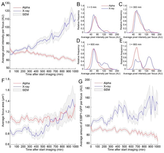 The average pixel intensity of 53BP1-GFP foci showed similar values at the start of imaging, for both treatments. After 400 min, an increase in intensity of 53BP1-GFP foci was observed in X-ray-irradiated cells, but not in α-particle-irradiated cells (Figure 3A). The large difference in focus intensity and increased error bars could have been caused by a change in population distributions of the analyzed foci. Therefore, we generated distribution plots of the average pixel intensity at the start of imaging (0 min), and after 300 min, 600 min, and 900 min (Figure 3B–E). Indeed, we observed a gradual shift toward higher average pixel intensities of foci induced by X-rays (Figure S2). Interestingly, at 900 min after irradiation, two clear populations were present, which did not arise in the α-particle-irradiated cells (Figure 3E).
