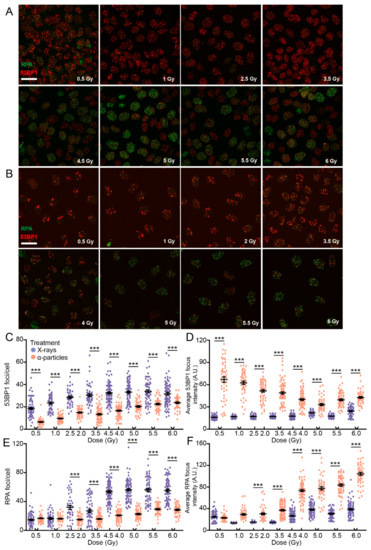 The differences in foci intensity and size over time after X-ray or α-particles could be related to differences in DNA damage load. Therefore, we performed a dose gradient experiment using both α-particle and X-ray irradiation, ranging from 0.5 to 6 Gy and fixed cells 1 h post irradiation. In addition, to investigate functional protein and minimize the interference of overexpression constructs, cells were stained for endogenous 53BP1 and RPA as markers for DSBs and resection, respectively (Figure 4A,B). Quantification of both 53BP1 and RPA was done by creating a segmentation mask using standard thresholds (see Section 4). The segmentation provided the number of foci, and the signal within the mask could be used to determine the average pixel intensity of a focus.