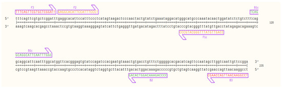 Nucleic acid sequence of the target OsHV-1 DNA fragment (235 bp) and designed LAMP primers binding sites; outer primers: F3 and B3 (red), inner primers: F2 and F1c (FIP) (orange), and B1c and B2 (BIP) (green) visualized using SnapGene Viewer® 5.0.4.