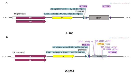 Maps showing the composition of two synthesized plasmids and primers binding to the target visualized using SnapGene 5.0.3.: (A) AbHV (3263 bp) and (B) OsHV-1 (3127 bp).