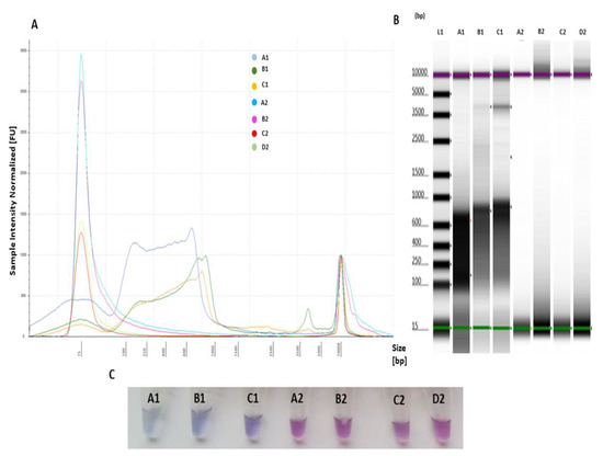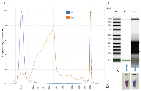 Amplification of OsHV-1 by LAMP assay: (A) electropherogram profile comparison of NTC (blue) and positive sample (OsHV-1 DNA-plasmid) (orange) analysed using Tape Station Analysis Software A.02.02 (Agilent Technologies, Cheshire, UK) with a progressive increase of the amplified LAMP product showing a size shift of 90–1000 bp; (B) gel image profile comparison: (L1)—ladder 15–5000 bp, (A1)—NTC and (B1)—positive samples showing a single high molecular band smear-like pattern (90 bp–1000 bp) of the amplified LAMP product visualized using Tape Station Analysis Software A.02.02 (Agilent Technologies, Cheshire, UK); and (C) NTC (violet) and positive samples (OsHV-1 DNA-plasmid) (blue) visualized using HNB.