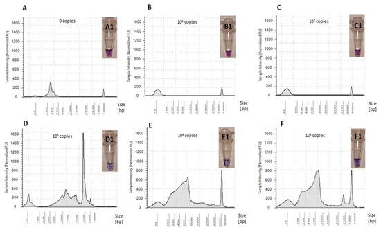 Electropherograms of NTC and five OsHV-1 plasmid standard amplifications in LAMP assay: (A) NTC—0 copies virus/reaction, (B) 101 copies virus/reaction, (C) 102 copies virus/reaction, (D) 103 copies virus/reaction, (E) 104 copies virus/reaction and (F) 105 copies virus/reaction. Colorimetric assessment of amplified LAMP products using HNB: (A1) NTC—0 copies virus/reaction, (B1) 101 copies virus/reaction, (C1) 102 copies virus/reaction, (D1) 103 copies virus/reaction, (E1) 104 copies virus/reaction and (F1) 105 copies virus/reaction.