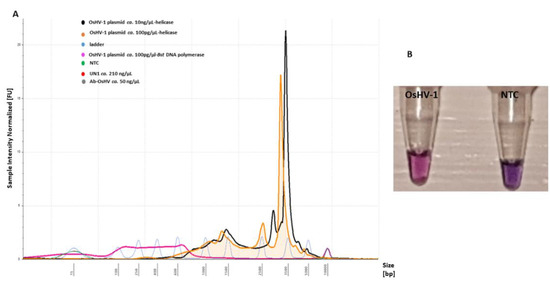 LAMP primer evaluation for amplification of the OsHV-1 plasmid (T = 65 °C, t = 10 min) and sensitivity with the addition of Tte UvrD helicase enzyme: (A) electropherogram comparison profiles of positive (OsHV-1 plasmid) and negative templates (NTC, UN_1 and AbHV) analysed using Tape Station Analysis Software A.02.02 (Agilent Technologies) for assessment of progressive increase of amplified LAMP product. Positive templates show a size shift of 350–5000 bp. (B) Colorimetric assessment of amplified LAMP products for positive (OsHV-1) (pink) and NTC (violet) templates using HNB.