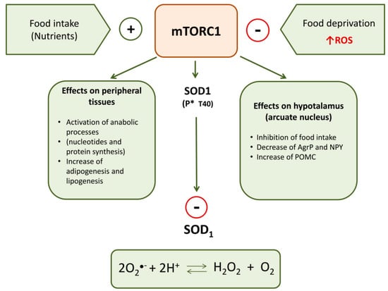 Recently, Tsang et al. [] reported a relation among SOD1, food intake-mediated ROS and mTORC1. SOD1 is a target of mTORC1 in nutrient signaling; in particular, mTORC1 regulates SOD1 activity through its reversible phosphorylation at threonine 40 (Thr-40). This kinase rapidly phosphorylates SOD1 in mammalian cells in response to nutrient signaling and this negatively influences the antioxidant activity of this enzyme. Therefore, nutrients stimulate mTORC1 that phosphorylates SOD1 inactivating its dismutase activity; in this way, nutrient signaling modulates ROS levels (Figure 1). During starvation, by the removal of mTORC1 inhibition of SOD1, the increase of ROS is counteracted, thus assuring protection against oxidative stress. Therefore, SOD1 phosphorylation by mTORC1 provides a dynamic mechanism in eukaryotic cells for redox control under varying nutrient conditions. It permits rapid growth in rich nutrient conditions while conferring resistance to O●− radical-induced stress during starvation.