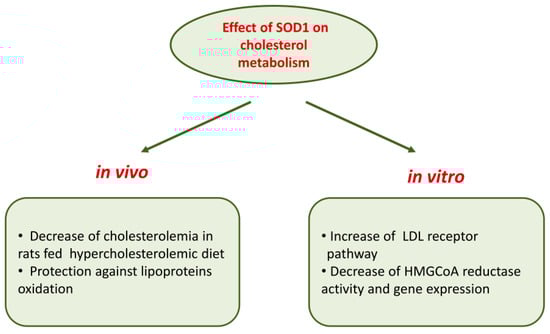 Further studies performed in wild-type human fibroblasts, in hepatocarcinoma Hep G2 cells and in fibroblasts of subjects affected by familiar hypercholesterolemia demonstrated that SOD1 inhibited HMG-CoA reductase gene expression at the transcriptional level; in addition, a strong downregulation of gene expression of sterol regulatory element-binding proteins (SREBP-2), a membrane-bound transcriptional factor, and LDL receptor was observed []. Figure 2 recapitulates the overall effects of SOD1 on cholesterol metabolism.