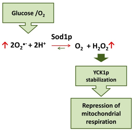 Evidence on the role of SOD1 in glucose- and oxygen-mediated repression of respiration in yeast has recently been accumulated. Yeast strains lacking CuZn superoxide dismutase (Sod1p) fail to completely repress respiration in the presence of glucose []. Moreover, it has been demonstrated that the mechanism involved in glucose-mediated repression of respiration in yeast cells involves the Sod1p-stabilization of casein kinase 1-gamma (CK1γ) homologs, Yck1p and Yck2p; these kinases are essential for glucose sensing and activation of pathways downstream leading to respiration repression [,]. Sod1p physically interacts with Yck1p; superoxide produced in the presence of oxygen and glucose is transformed by Sod1p in H2O2 which stabilize Yck1p. Therefore, glucose and O2 stabilize these casein kinases seemingly by controlling the amount of superoxide substrate for Sod1p. In this way, SOD1 transmits signals from oxygen and glucose to repress respiration [] (Figure 3).