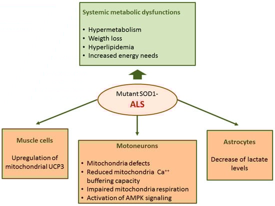 Abnormalities in ALS are not restricted to motoneurons but rather ALS can be considered a systemic disease with spreading effects including several defects in energy metabolism. Energy imbalance is associated with weight loss and hypermetabolism; ALS patients usually lose weight and body fat with disease progression []. In addition, hyperlipidemia with increased LDL-cholesterol and decreased HDL-cholesterol levels have been found in ALS patients in different studies []. Furthermore, multiple genetic analyses show that elevated low-density lipoprotein cholesterol is a causal risk factor for ALS []. The dysregulation of energy metabolism in ALS is also supported by studies in rodent models. In transgenic mice expressing human mutant SOD1, the most common genetic animal model of ALS, metabolism is higher and body weight and fat mass are lower compared to wild-type mice [].