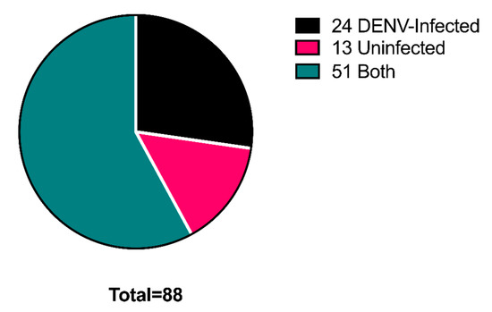 Extracellular vesicles were isolated from DENV-infected and uninfected Ae. aegypti cells. Proteins from both EV samples were processed and identified by mass spectrometry. Of the 88 total proteins identified, while the majority were observed in the EVs from both infected and uninfected cells (51, 58%), several were observed only in the EVs derived from DENV-infected cells (24, 27%) and in EVs from uninfected cells (13, 15%).