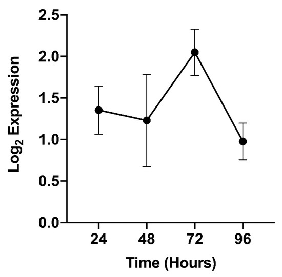 To better understand the DENV infection-dependent packaging of AAEL002675 in EVs, it was important to examine how DENV infection affected the expression of AAEL002675 in Ae. aegypti. In doing so, Ae. aegypti cells were infected with DENV and the level of AAEL002675 gene expression was measured from 24 to 96 hours post-infection (Figure 5). At all times following infection, an increase in the expression of AAEL002675 was observed, with a pronounced peak of expression at 72 hours post-infection.