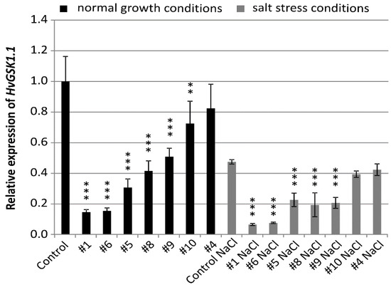Expression of HvGSK1.1 in salt stress was lower when compared to plants in normal growth conditions. Relative expression in the non-transgenic control in salt stress was 0.47 of expression in normal conditions. In 5 lines #1 (0.06), #6 (0.07), #5 (0.22), #8 (0.19), and line #9 (0.20)-relative expression in salt stress conditions was significantly (p < 0.001) lower (Figure 1).