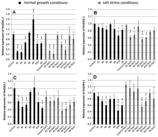 Silencing of the target HvGSK1.1 modified expression of four GSK paralogs HvGSK1.2, HvGSK2.1, HvGSK3.1, and HvGSK4.1. Relative expression of the paralogs varied depending on the line and the growth conditions. Relative expression of HvGSK1.2 in the five lines: #1 (0.33), #6 (0.29), #5 (0.68), #10 (0.63), and #4 (0.64) grown in normal conditions was significantly (p < 0.001 and p < 0.01) lower than in the non-transgenic control (Figure 2A). Expression in salt stress conditions in the five lines #1 (0.35), #6 (0.23), #8 (0.60), #9 (0.37), and # 4 (0.81) was significantly (p < 0.001 and p < 0.05) lower than in the non-transgenic control (Figure 2A). Expression of HvGSK2.1 was slightly downregulated in transgenic lines grown in normal conditions (Figure 2B). In salt stress, however, relative expression of the four lines #1 (0.62), #6 (0.69), #8 (0.57), and #9 (0.61) was significantly (p < 0.01 and p < 0.001) lower when compared to the non-transgenic control (Figure 2B).