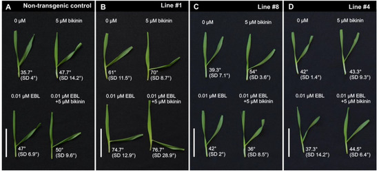 Representative pictures of leaf fragments treated with 24-epibrassinolide (EBL) 0.01 µM, bikinin 5 µM, and EBL (0.01 µM) and bikinin (5 µM) applied together. (A)–the non-transgenic control plants, (B)–line #1 with strong silencing of HvGSK1.1, (C)–line #8 with intermediate silencing of HvGSK1.1, and (D)–line #4 with alleviated silencing of HvGSK1.1. Indicated are medium inclination angles and standard deviation (SD) of at least five plants. Bar represents 5 cm.