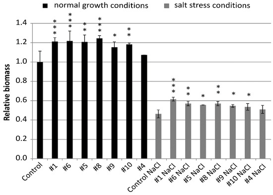 Biomass of the plants grown in salt stress was smaller and, for the non-transgenic control, it was 0.46 of the biomass in normal conditions. However, relative biomass of all lines #1 (0.62), #6 (0.57), #5 (0.55), #8 (0.57), #9 (0.55), #10 (0.54), and #4 (0.51) was greater than the control from the same conditions. The values shown by three lines #1, #6, and #8 exceeded the control by 24% to 35% with significance at p < 0.01 and p < 0.001. The values of another lines #5, #9, and #10 exceeded the control by 17% to 20% with a significance at p < 0.05 (Figure 4).