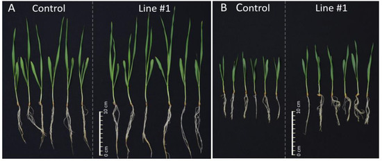 Representative pictures of 14-days-old seedlings of the non-transgenic control and the line #1. (A) 14-days-old seedlings of the non-transgenic control and the line #1 grown in normal conditions (Hoagland medium). (B) 14-days-old seedlings of the non-transgenic control and the line #1 grown in salt stress conditions (Hoagland medium supplemented with NaCl 200 mM).