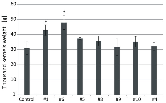 Thousand kernel weight (TKW) of the control plants grown in normal conditions was 31 g (Figure 6). In transgenic lines, the values were: #1 (43), #6 (47.9), #5 (37.4), #8 (35.8), #9 (31.6), #10 (35.3), and #4 (32). The TKW values of #1 and #6 were significantly (p < 0.05) higher than those of the control (Figure 6 and Figure 7).