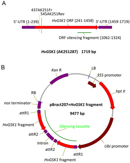 Schematic representation of cDNA of HvGSK1.1 gene (A) and pBract207 vector with HvGSK1.1 fragment built into the silencing cassette (B). Open reading frame (ORF) fragment used for construction of the silencing cassette in the pBract207 vector is indicated (A). The most important functional regions of the pBRACT207 vector are indicated (B). The open reading frame (ORF) fragment of HvGSK1.1 used for gene silencing was amplified with AmpliTaq Gold DNA Polymerase (ThermoFisher Scientific) with the primers ORFgskFR/ORFgskRe (Table 2), and the vector pCR2.1TOPO with cloned HvGSK1.1 cDNA as a template. Gel purified amplicon was blunt-end cloned into the pIPKTA38 [64]. The obtained plasmid pIPK:ORF was used as the entry clone for Gateway recombination (Invitrogen) with destination vector pBRACT207 (John Innes Center, Norwich, UK, www.bract.org).