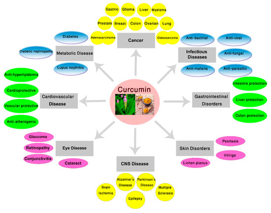 In this section, we will discuss the several effects of curcumin, including antimicrobial, gastrointestinal, cardiovascular, anti-cancer, ant-inflammatory, neuroprotective in different disorders which have been previously reported. These findings, comprising cell line studies, animal studies, and clinical trials. Then, the possible mechanisms will be described based on disease categories. As shown in Figure 1, there is a wide variety of studies on curcumin ranging from gastrointestinal, central nervous system, and cardiovascular effects, to antimicrobial and anti-cancer characteristics.