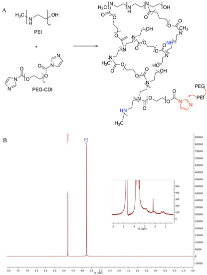 Reaction scheme of polyethylene glycol (PEG)-polyethylenimine (PEI) nanogels (NGs) formation (A) and its 1H-NMR spectrum (B).