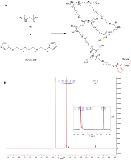 Reaction scheme of pluronic (Plu)-PEI NGs formation (A) and its 1H-NMR spectrum (B).