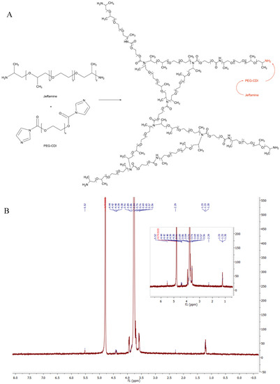 Reaction scheme of PEG-Jeffamine (Jef) NGs formation (A) and its 1H-NMR spectrum (B).