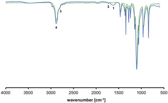 FTIR spectra of Plu-PEI (blue) and PEG-Jef (green).