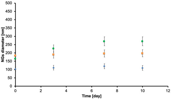 Variations in time (day) of hydrodynamic diameter (nm) of PEG-PEI NGs (orange), Plu-PEI NGs (blue), and PEG-Jef NGs (green). All NGs show a stable trend in time.