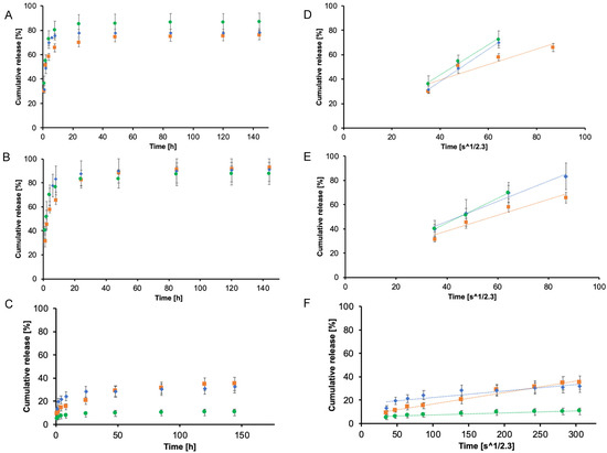 The influence of the systems in delivering drug mimetics was investigated plotting release percentage against the time to the power of 0.43 (t1/2.3 in Figure 6D–F). A linear plot is representative of Fickian diffusion and the y-axis intercept value is an indication of burst release, where it is well-known that an ideal controlled release system should present a linear trend in time and its y-axis intercept should be equal to zero.