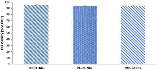 The synthetized nanogels were evaluated as biocompatible systems in a biological environment. In vitro cytotoxicity tests were realized by culturing microglia for three days, while sharing the medium with nanogels, and then measured with MTS assay. The quantity of nanogel dissolved in the cell medium is in accordance with the concentration commonly used in pharmacological treatments and in biomedical applications [34]. In Figure 7, cell viability in presence of PEG-PEI NGs, Plu-PEI NGs, and PEG-Jef NGs is reported. A similar trend can be observed in all samples and is comparable to the cells trend without nanogel treatment (CTRL).