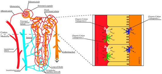 Schematic view of a nephron and a close-up of proximal tubule cells with organic cation transporters (OCTs) present in plasma membranes. In addition to glomerular filtration, organic cations (OCs) can be excreted in the proximal convoluted tubules, where OCT2 and OCT3 facilitate the uptake of compounds from the peritubular capillaries over the basolateral membrane into the intracellular space, and OCT1 mediates the uptake from the ultrafiltrate over the apical membrane.