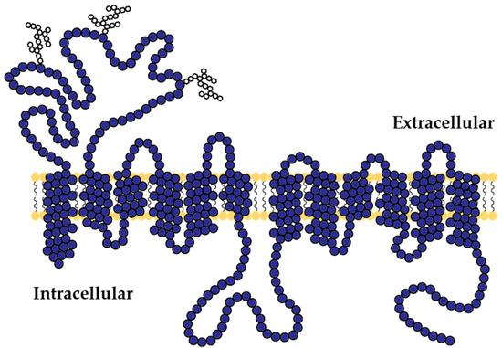 The SLC22A transporter family members consist of 12 α-helical transmembrane domains with an extracellular glycosylated loop between domains 1 and 2. The large intracellular loop with the designated phosphorylation sites is found between the 6th and 7th domain [2,3,4] (Figure 2).