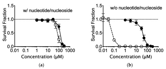 AlphaMEM medium, supplemented with nucleoside and nucleotide, contains 10.0 mg/L thymidine (0.041 mM). In order to understand the cytotoxic effects of EdU on CHO cells, AlphaMEM medium (nucleotide/nucleoside deficient) was utilized during colony formation. BrdU cytotoxicity was enhanced in the absence of thymidine. There was nearly a 1000-fold decrease in survival fraction in cells treated with EdU and absence of nucleotide/nucleoside (Figure 1a,b).