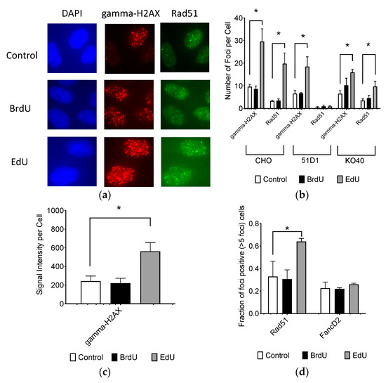 BrdU-and EdU-induced DNA damage repair responses were investigated via immunocytochemistry. Cells were treated with 10 μM of BrdU or EdU for 24 h. Then cells were fixed in 4% paraformaldehyde and permeabilized by 0.5% Triton X-100 and 0.1% SDS. After blocking in 10% goat serum, mouse monoclonal antibody for anti-gamma-H2AX (Millipore-Sigma), rabbit polyclonal antibody for Rad51 (Santa Cruz Biotechnology, Santa Cruz, CA, USA), and rabbit polyclonal antibody for FancD2 (Novus Biological, Centennial, CO, USA) was used as previously described [43]. Secondary antibody was Alexa Fluor 488 or Alexa Fluor 594 conjugated antibody. Cells were mounted in a solution of 2 μg/mL DPI containing slow-fade (Invitrogen, Carlsbad, CA, USA). Fluorescent images were captured using a Zeiss Axioskop fluorescent microscope (Zeiss, Oberkochen, Germany) equipped with Q-imaging Aqua Camera (Q-imaging, Montreal, QC, Canada) with Q-capture pro software. Three independent experiments were performed. Manual counting was performed for 50 cells to obtain the average number of foci per cell. Signal intensity was obtained with Q-capture pro software.