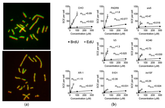 - Gutierrez, C.; Gonzalez-Gil, G.; Hernandez, P. Analysis of baseline and BrdU-dependent SCEs at different BrdU concentrations. Exp. Cell Res. 1983, 149, 461–469. [Google Scholar] [CrossRef]