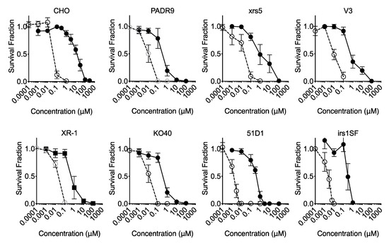 Cell survival curves against BrdU or EdU in DNA repair-deficient cells in the nucleotide and nucleoside free media. Closed circles indicate BrdU treatments and open circles indicate EdU treatments. Error bars represent the standard error of the mean of three independent experiments.