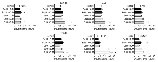 Both BrdU and EdU increased cell doubling time in a dose dependent manner (Figure 6). Administration of 10 μM BrdU or EdU, in the presence of nucleotide/nucleoside, did not alter cell doubling time significantly (p > 0.05). BrdU (100 μM) increased doubling time for all cell lines, but a statistically significant difference was observed in CHO wild type and irs1SF cells. Delay of cell doubling time was strongly observed in EdU-supplemented cells. An amount of, 50 μM of EdU showed severe growth delay in all cell lines, which were statistically significant differences compared to the basal level. Lastly, an EdU’s growth inhibitory effect was strongly observed in homologous recombination repair-deficient cell lines, 51D1 and irs1SF. Treatment of 50 μM of EdU, 51D1 and irs1SF presented doubling times of 75 and 45 h, respectively; their basal doubling times were 16 and 18 h, respectively.