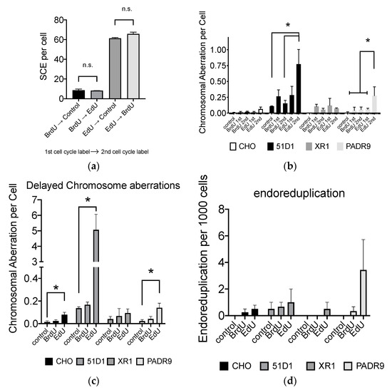 Delayed EdU effect for genomic damages. (a) The first cycle with BrdU or EdU determines SCE formation but not the second cycle. BrdU or EdU (50 μM) was incorporated; (b) EdU affects second post-treated metaphase and induces chromosomal aberrations. Chromosomal aberrations were compared with control, after one complete cycle of 10 μM BrdU or EdU treatment, and after two complete cycles of 10 μM BrdU or EdU treatment; (c) delayed chromosome aberration formation with DNA repair-deficient cells treated with 10 μM BrdU or EdU; (d) endoreduplication formation after 10 μM BrdU or EdU treatment. Error bars represent the standard error of the mean of three independent experiments. One-way ANOVA, Dunnett’s Multiple Comparison Test was performed to provide p-values. * indicates statistically significant differences. n.s. stands for not significant (p > 0.05).