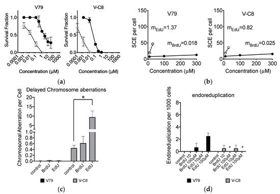 BrdU and EdU effects for Chinese hamster lung origin V79 cells and their BRCA2-deficient V-C8 cells. (a) Cytotoxicity with BrdU or EdU treatment; (b) SCE formation with BrdU or EdU treatment; (c) delayed effect for genomic damages after 10 μM BrdU or EdU; (d) endoreduplication formation after BrdU or EdU treatment. Closed circles indicate BrdU treatments and open circles indicate EdU treatments. Error bars represent the standard error of the mean of three independent experiments. One-way ANOVA, Dunnett’s Multiple Comparison Test was performed to provide p-values. * indicates statistically significant differences. n.s. stands for not significant (p > 0.05). # indicates no data available due to high toxicity.