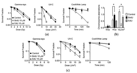 A failure of sensitization of EdU to photon exposure was confirmed with a chromosome aberration assay (Figure 9b). BrdU produced more dicentric chromosomes with 4 Gy of gamma-ray irradiation (p < 0.05). For BrdU-treated cells, 10 J/m2 of UV-C exposure was extremely toxic; thus, no metaphase chromosomes were obtained. Interestingly, EdU-treated cells showed a reduced quantity of chromatid exchanges, significantly different when compared to control cells with UV-C exposure (p < 0.05). Further confirmation was carried out with A549 human lung cancer cells (Figure 9c). BrdU photosensitized A549 to gamma-ray, UV-C, and fluorescent light, however, EdU did not.