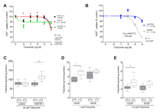 Tofacitinib is charged under physiological pH-conditions (Figure 1B). Because transport of organic cations mediated by MATE-1 is pH dependent, we observed an export of Tofacitinib [21]. The synovial fluid in RA patients has been reported to exhibit an acidic pH, under these conditions MATE-1 is expected to mediate efflux of Tofacitinib [25,26]. To investigate the intracellular concentration of both TKIs we chose the maximum plasma concentration for Tofacitinib and Baricitinib for our experiment. The concentration for Baricitinib was described as 150 nM, and 400 nM for Tofacitinib [27,28]. As expected, we did not observe a temperature-dependent increase of Baricitinib in fibroblasts (Figure 2D). This indicates that, due to its neutral charge, Baricitinib can penetrate the cell membrane without active transport. However, our data do not exclude that other transporters might contribute to the transport of Baricitinib into the cells. Tofacitinib in contrast is actively transported into fibroblasts. We found that MATE1 is the responsible transporter (Figure 3C). Interestingly, we found that OASF show a temperature-dependent lowering of Tofacitinib concentrations, indicating an active export of the drug from the cells (Figure 3D,E). This correlates with the increased MATE1 expression in OASF, which is reduced under inflammatory conditions. For this reason, in RASF, Tofacitinib is not exported.