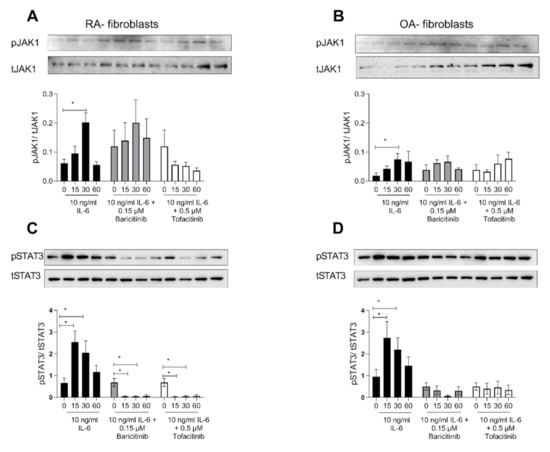 For each RASF/OASF sample, a total of 1 × 106 cells were seeded in a 25 cm2 cell culture flask and the cells became adherent overnight. The cells were stimulated with 10 ng/mL IL-6 for 0, 15, 30 and 60 min with either Tofacitinib (1 µM, 0.4 µM) or Baricitinib (1 µM, 0.15 µM). Cells lysis was performed using NP-40- buffer and proteinase inhibitor cOmplete Ultra. Cell lysates were run on a 10% SDS-PAGE and transferred to a PVDF membrane. Blocking was performed in 5% BSA solution. Primary antibody against phospho-Jak1 (#74129), Jak-1 (#3344), phosphor-Stat3 (#9145), Stat-3 (#30835), GAPDH (#2118) diluted 1:1000 in 5% BSA were incubated over night at 4 °C. The secondary antibody was an HRP-conjugated anti-rabbit (#7074) 1:8000 in 5% BSA. All antibodies were bought from Cell Signaling (Danvers, MA, USA). Enhanced chemiluminescence (ECL) was used for Western blot detection, and quantification of bands was performed using ImageJ Software (U.S. National Institutes of Health, Bethesda, MD, USA, https://imagej.nih.gov/ij/, 1997-201).