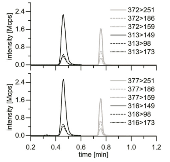 Transitions of Baricitinib and Tofacitinib (above) and IS (below). Tofacitinib is shown to the left in black, to the right Baricitinib in grey.
