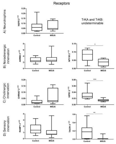 : Differential gene expression of neuronal receptors in bone between control and mice exposed to early life stress (MSUS) mice. Shown are the gene expression of neurotrophin receptors (A), noradrenergic receptors (B), cholinergic receptors (C) and receptors involved in sensory innervation (D). Data (n = 8 per group) are expressed as Min to Max of 2−dCt. Significance level: *** p < 0.001, ** p < 0.01 and * p < 0.05 between indicated groups.