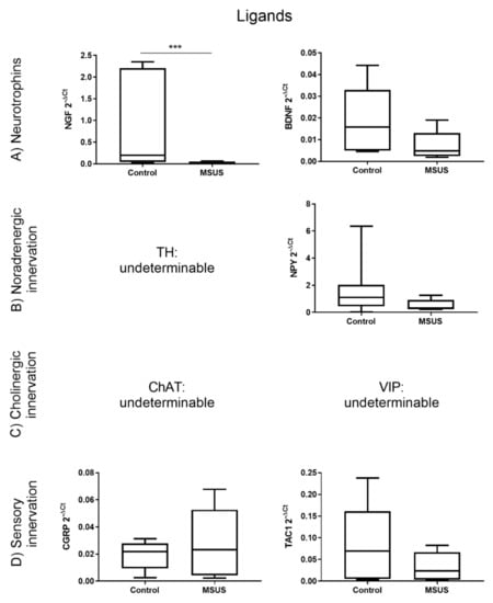 Differential gene expression of neuronal ligands in bone between control and MSUS mice. Shown are the gene expression of neurotrophins (A), noradrenergic ligands (B), cholinergic ligands (C) and ligands involved in sensory innervation (D). Data (n = 8 per group) are expressed as Min to Max of 2−dCt. Significance level: *** p < 0.001 between indicated groups.
