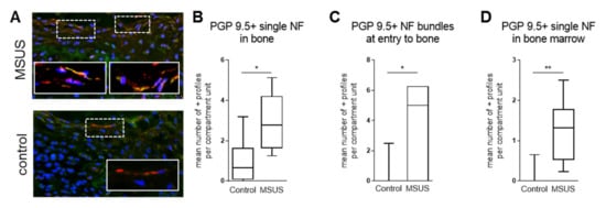 We subsequently investigated bone innervation by immunohistomorphometry. The density of nerve fibers labeled with the pan-neuronal marker protein gene product 9.5 (PGP 9.5) was significantly increased in the bone of MSUS mice (Figure 3), whereas nerve fibers labeled with the neuronal plasticity marker GAP 43 were unaffected (not shown), indicating that higher innervation was not due to increased neuronal plasticity, but was likely a stable feature. Higher innervation density potentially leads to higher sensitivity of bone neurons to stimuli like injury. Notably, the neuropeptides NPY, VIP and SP were undetectable by immunohistochemistry, most likely due to insufficient bone preservation. This likely results from the post-mortem fixation method used for ethical requirements, which does not preserve small peptides (the eleven amino-acid sequences of SP, for example, are rapidly digested by endogenous enzymes after termination of circulation) [,,].