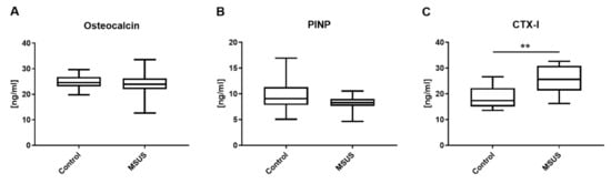 While MSUS mice showed a clear neuroendocrine response pattern, the gene expression of typical bone markers (in bone) was unaffected. Similarly, we did not observe increased osteocalcin in the serum of MSUS mice. However, CTX-I serum levels were significantly increased in MSUS mice. CTX-I is an increasingly promoted and robust biochemical factor for bone resorption in clinical settings [,,,]. Additional analyses, such as bone histomorphometry to determine whether MSUS leads to alterations in the numbers of osteoblasts (type 1 procollagen staining) and/or osteoclasts (TRAP staining) [] could provide useful insights into bone adaptation processes.