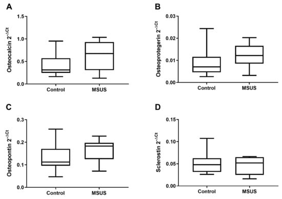 Gene expression of extracellular matrix in bone of mice. Shown are the gene expressions of tissue-specific extracellular matrix markers in bone of controls and MSUS. Genes include osteocalcin (A), osteoprotegerin (B), osteopontin (C) and sclerostin (D). Data (n = 8 per group) are expressed as Min to Max of 2−dCt. Significance level: all p > 0.05.