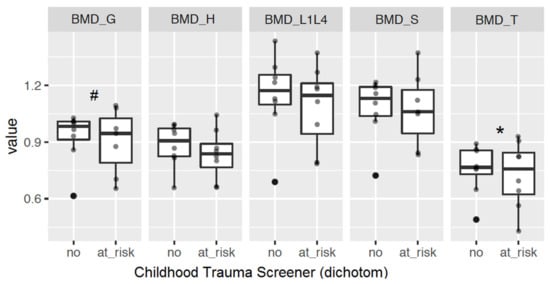 Multiple regression models, adjusted for age, gender, and study sides. Significant Regression coefficients b are bold. Significance level: * p < 0.05, and # p < 0.1. a Childhood Trauma Screener (CTS) at least at risk for one type of neglect or abuse (sexual, physical, emotional abuse, physical, emotional neglect); b Inventory of Stressful Life Events; stressful life events during childhood (≤12 years); c Bone mineral density (BMD) was measured as mean value (M) in the lumbar spine L1-L4 (lumbar vertebralis bodies), T (trochanter major), S (corpus femoris), G (total), and H (collum femoris).