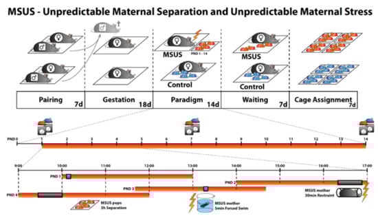 Unpredictable maternal separation and maternal stress during early life (mice exposed to early life stress (MSUS) paradigm []) is an experimental stress paradigm in rodents that can mimic aspects of childhood maltreatment and induce long-lasting health effects, such as increased depression-like behavior (anhedonia) and altered brain activity in adulthood []. The MSUS paradigm severely impacts physiology and behavior in the exposed animals, but also in their descendants across several generations via mechanisms involving epigenetic factors in the germline [,,,].